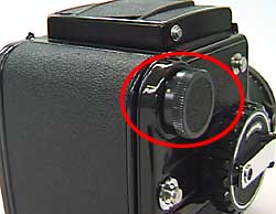Multiple exposures are done by the knob encircled in the figure. Normally, the yellow-colored dot on it is set to the yellow-colored line on the camera body (when taking a single exposure).