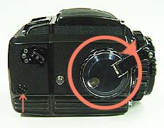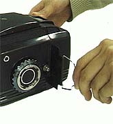 Turn the film wind crank clockwise until the frame counter shows "1" in the window. Note: Pull out the dark slide when shooting.