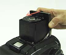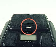 The focusing hood opens by sliding the button at the back on the top cover in the direction of the arrow. And the magnifier raise up by inclining the top cover a little toward the inside.