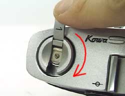 撮影が終われば、ボディ上部についているフィルム巻き上げクランクでフィルムを巻き上げましょう。ツメをおこして、矢印の方向にまわします。