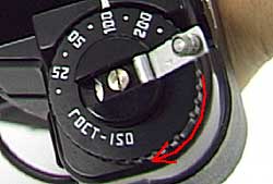 クランクを引き起こし、矢印の方向へ回してフィルムを巻き戻したら、先ほどと同じ手順で裏蓋を開けてフィルムを取り出しておきます。