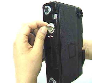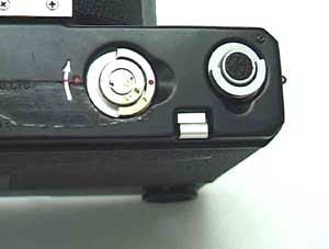 レンズの交換の手順です。 ボディ底部のロックの赤丸をあわせます。 これによってフィルムの直前に露光防止の黒幕が引かれるため、 レンズの取り外しが可能になります。