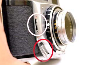 白丸部分のレバーをX側にひき下げて赤丸部分のレバーを引けばセルフタイマーがセットされます。。