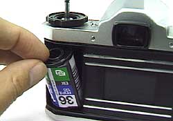 感触が軽くなってフィルムが完全に巻き戻せたら、裏ふたを開けてフィルムを取り出します。