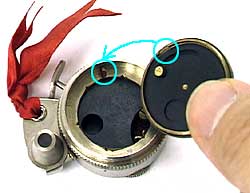 ボディを開けると、中に赤く塗ってあるネジがあります。 そのネジと、マガジンのふちの欠けている部分が噛み合うようにマガジンをセットします。