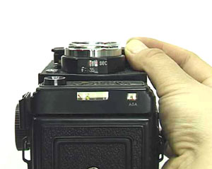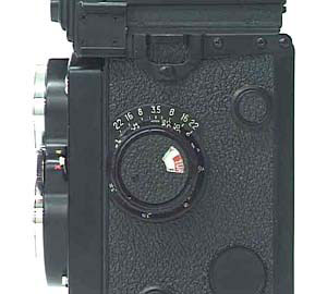 絞り、シャッター速度はそれぞれレンズ両脇にあるダイヤルで行います。 フォーカシングはボディ左横のノブで行います。距離目盛、被写界深度目盛の表示付きです。