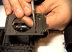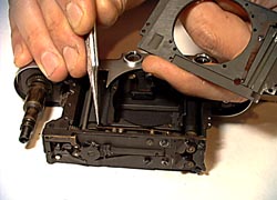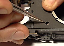 そして、前面パネル裏のガバナーのリセットレバー(写真のピンセットの先の部分)をボディ側のレバーにひっかけます。