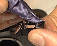 マイクロクロスなどをピンセットの先に丸く巻いて、ファインダーブロックを拭いて清掃します。