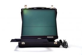 ミノックスで撮影したネガを標準のマイクロフラッシュ・ホルダー(10.5×14.8センチMINOXネガホルダーとほぼ同大)に収めて、スクリーンに投影して見るマイクロフィルム・リーダーです。